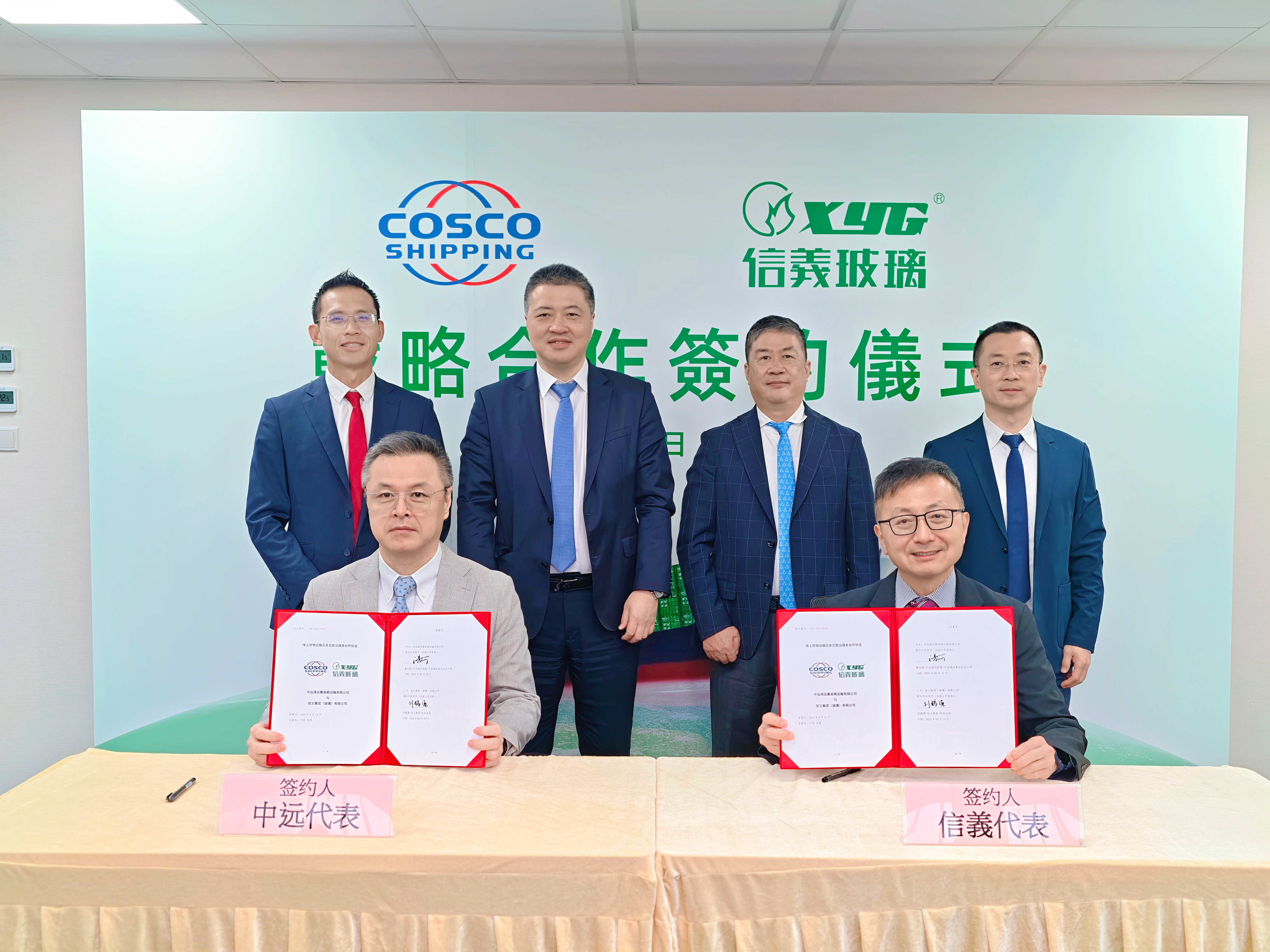 9月19日,信義玻璃(00868. HK)與中遠(yuǎn)海運集裝箱運輸有限公司(簡稱“中遠(yuǎn)海運集運”)在香港信義玻璃總部舉行戰(zhàn)略合作簽約儀式,中遠(yuǎn)海運集裝箱運輸有限公司董事長陶衛(wèi)東、集運董事鮑旭、總會計師潘志剛、信義玻璃執(zhí)行董事兼行政總裁董清世、信義玻璃執(zhí)行董事兼副總裁李圣根、信義玻璃財務(wù)總監(jiān)劉錫源及相關(guān)團隊代表共同出席簽約儀式。